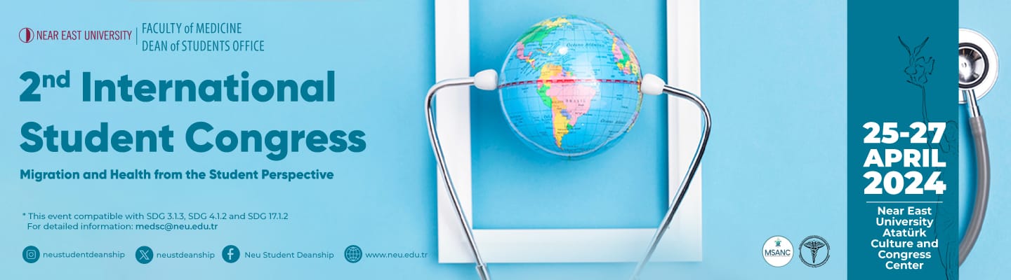 Dear Participants, We are delighted to invite you to the 2nd International Student Congress of Near East University Faculty of Medicine, which will take place on April 25-27, 2024, focusing on "Migration and Health from the Student Perspective" Hosted on our beautiful island by students from various countries, we hope this event will serve as a unique platform for in-depth exploration of migration and health. Migration is not merely a geographical shift from one point to another on the map; it is a phenomenon that leaves profound cultural, social, and health impacts. This congress will address the increasing global migration and its direct and indirect effects on health. Migration significantly influences the dynamics of a society and its healthcare system. This congress aims to bring together academics, researchers, healthcare professionals, and future physicians who seek to understand the direct and indirect effects of migration on human health. It will foster knowledge sharing, shape future health policies, discuss current issues related to migrants' access to healthcare, propose solutions based on existing research, and contribute to the overall knowledge in this field. We invite you, esteemed participants, not only to share knowledge but also to share your own migration stories and perspectives, forge new friendships, and explore the unique culture of Cyprus. This congress will not only facilitate interaction with experts in health and migration but also provide an opportunity for interdisciplinary collaboration, sparking creative ideas. We look forward to welcoming you to this comprehensive congress on migration and health. Best regards, Int. Dr. Suğde AKTUN Int. Dr. Okan ERDEMSİZ Int. Dr. Süleyman GÜNDÜZ